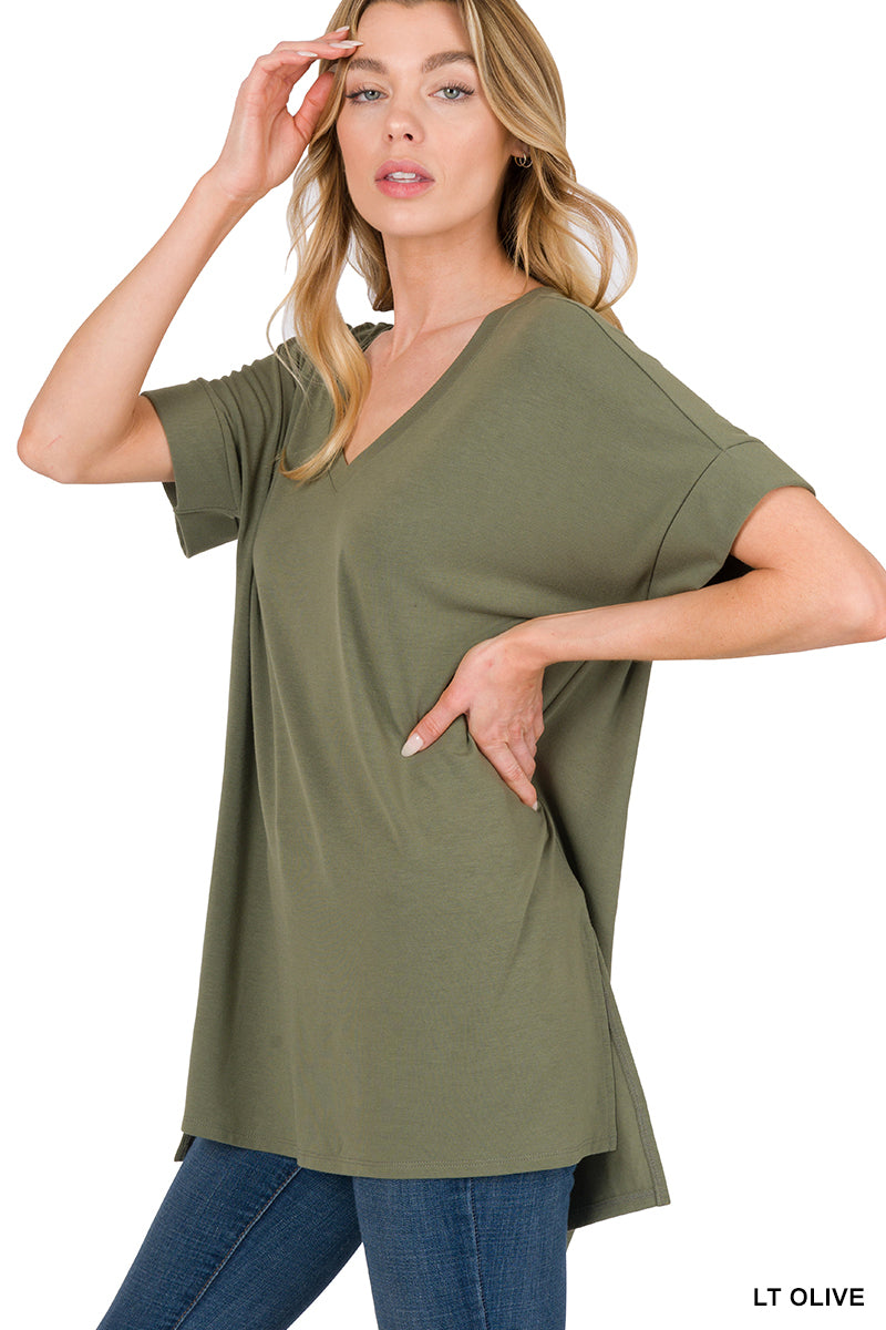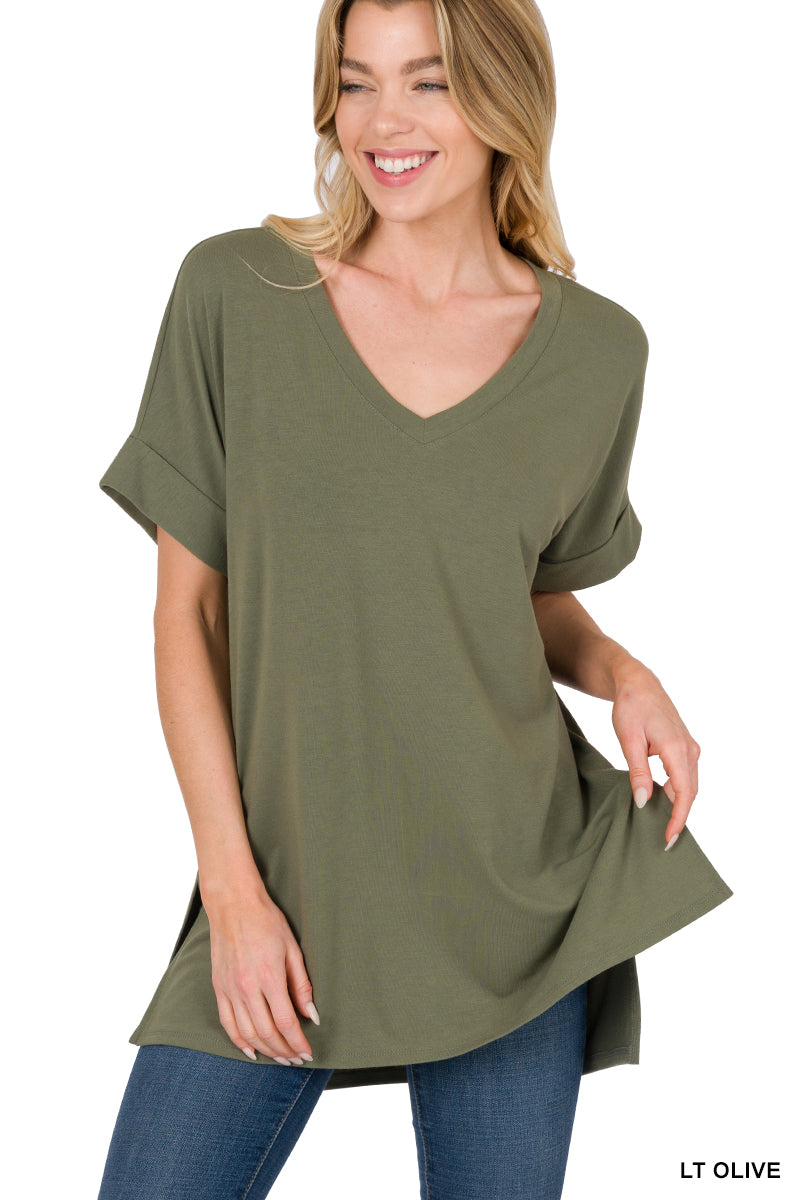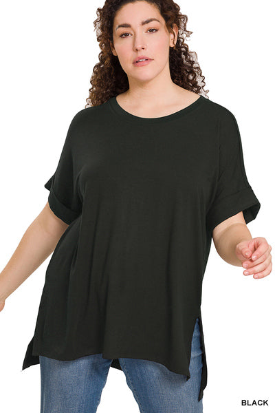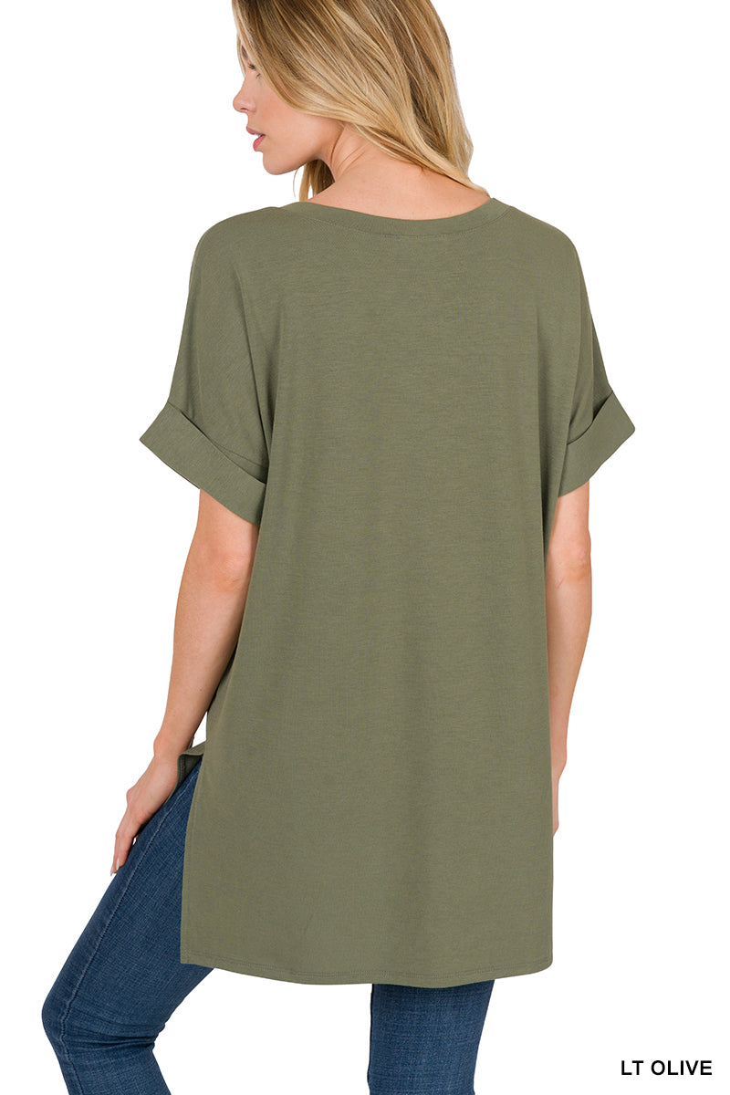 ROLLED SHORT SLEEVE ROUND NECK TOP WITH SIDE SLIT HIGH-LOW HEM