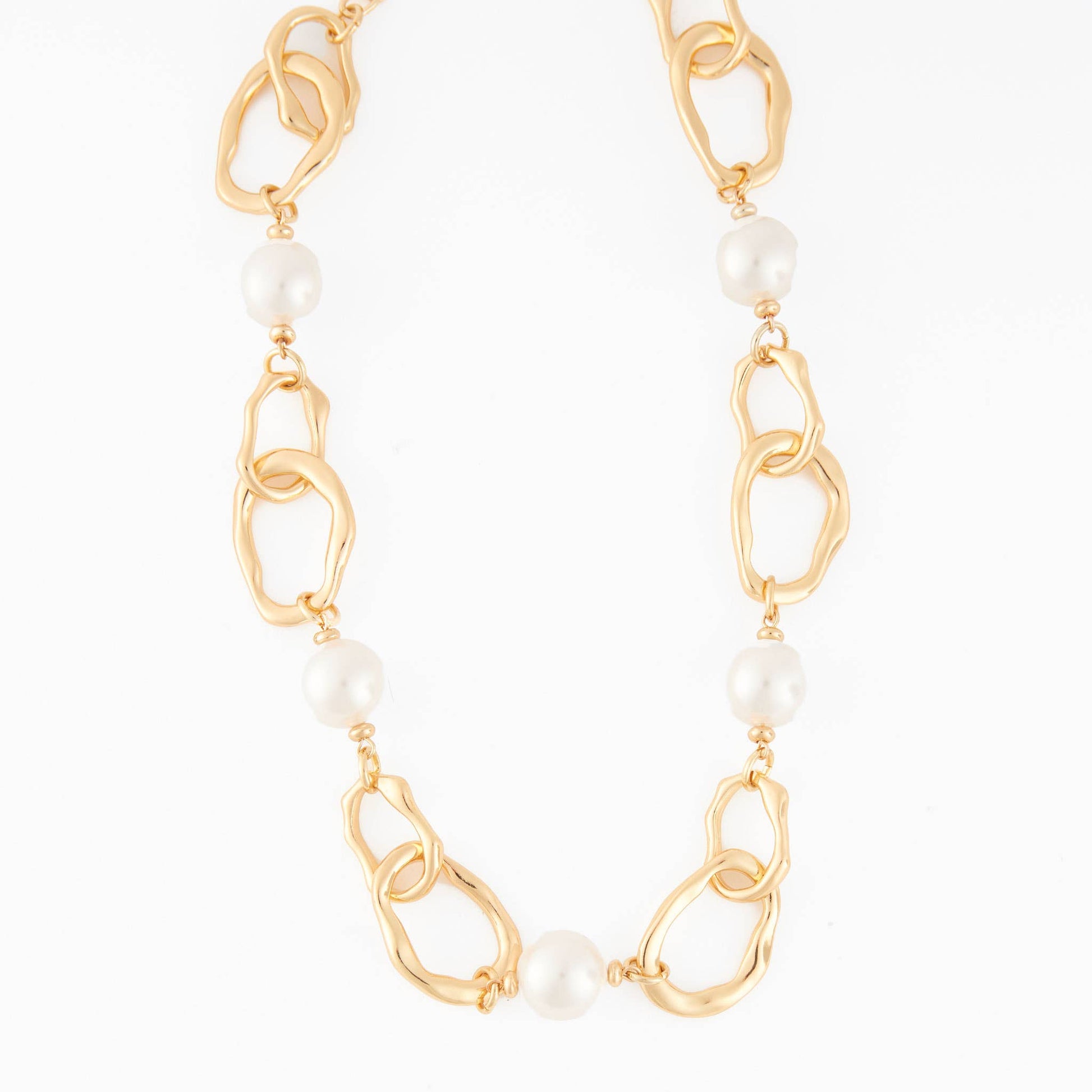 Elevate your look with the Elodie Gold Chunky Linked Faux Pearl Necklace — a statement piece that perfectly balances bold design with timeless sophistication. This 18" necklace features oversized organic gold links, artfully arranged with lustrous faux pearls that exude elegance and charm. The sculptural, fluid shape of each link adds texture and dimension, giving this piece a modern twist on classic pearl jewelry. Designed for effortless wear and all-day comfort, the Elodie Necklace transitions seamlessly from daytime polish to evening glamour. Whether layered with delicate chains or worn alone as a standout accessory, this necklace captures a chic, contemporary aesthetic with a nod to vintage inspiration. Perfect for gifting or elevating your own jewelry collection, the Elodie Gold Chunky Linked Faux Pearl Necklace embodies confidence, femininity, and timeless luxury that complements every wardrobe.