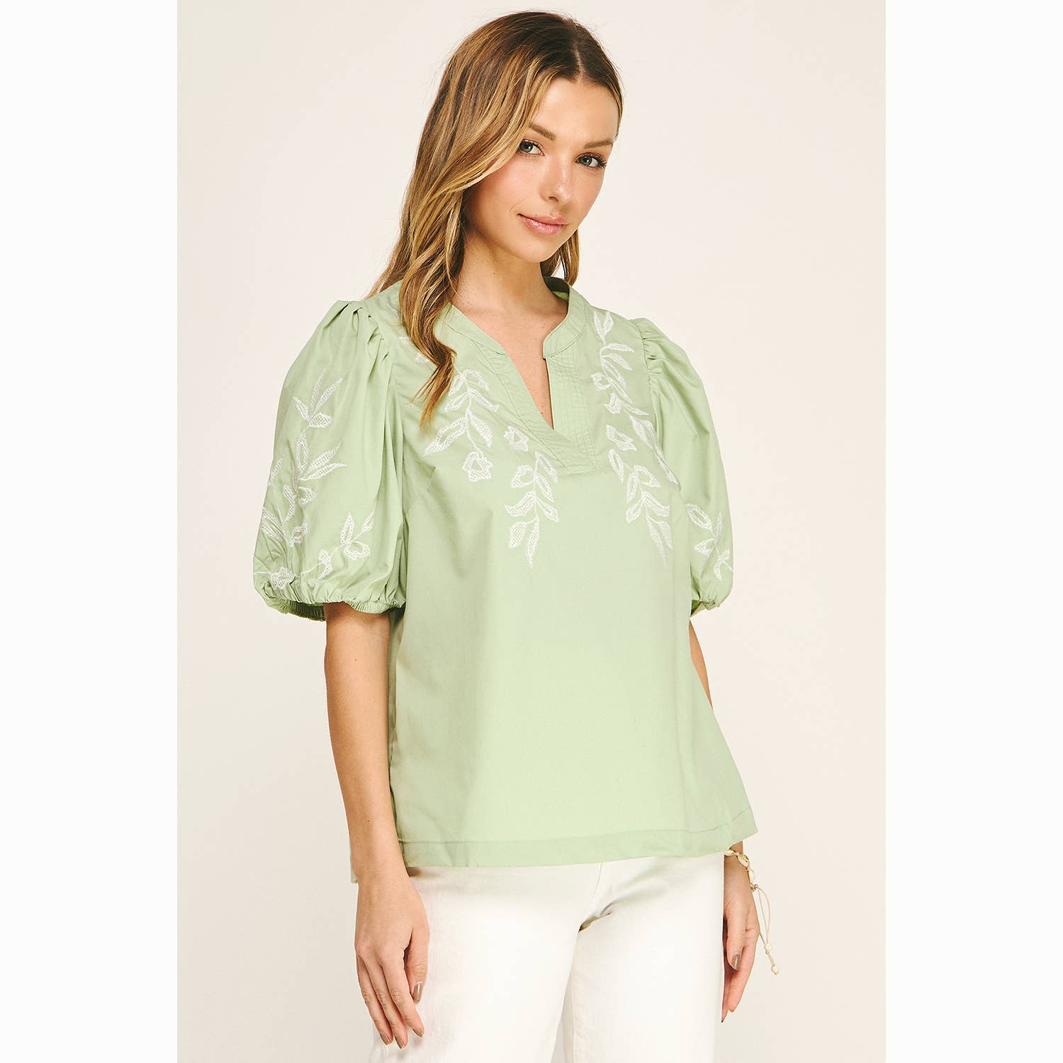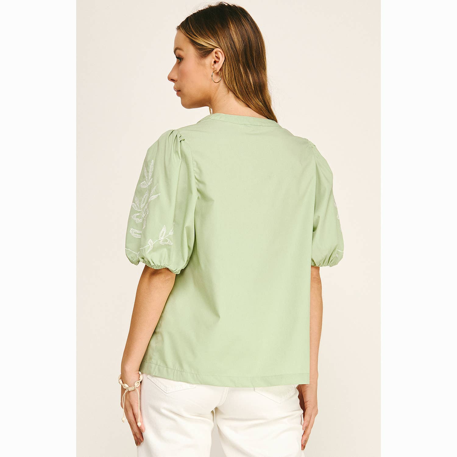 - Soft puff sleeves with elastic cuffs