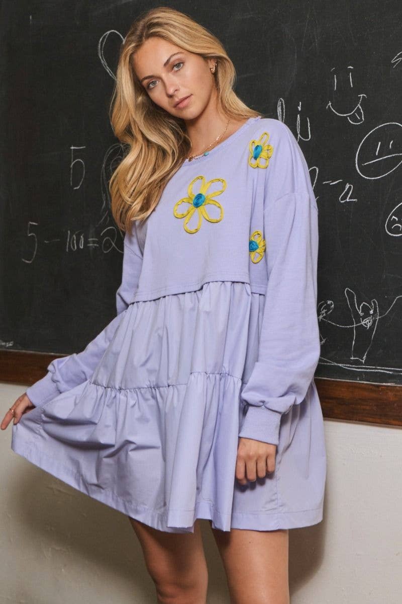 Flower embroidered french terry long sleeve sweatshirt dress with poplin skirt.