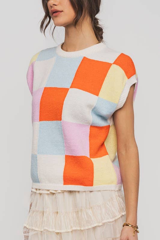 SHORT SLEEVES CREW NECK LINE MULTI CHECKER KNIT SWEATER TOP WITH RIB CUFFS NECK AND HEM. Model's wearing size small and her height is 5'8" Color may vary slightly due to monitor resolution.