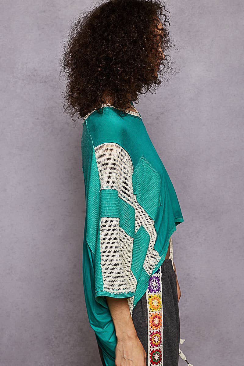 Designed in V-neckline knit top, oversized fit, drop shoulder, see through fabric mixed, frayed edge detailing throughout the garments. featured in Pol's jersey