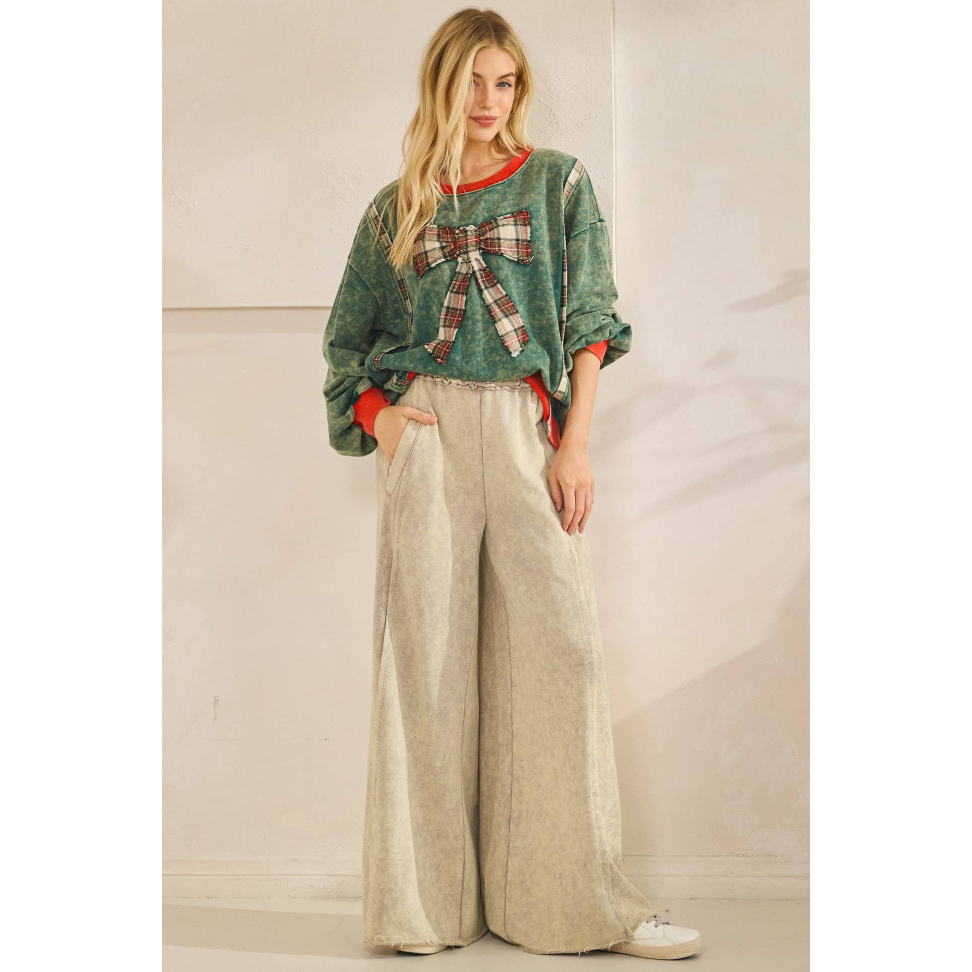 Featuring a mineral-washed base with contrast red ribbed trim and a frayed plaid bow applique front and center this sweatshirt brings the perfect pop of cheer to your winter lineup.Boutique-ready and full of character!