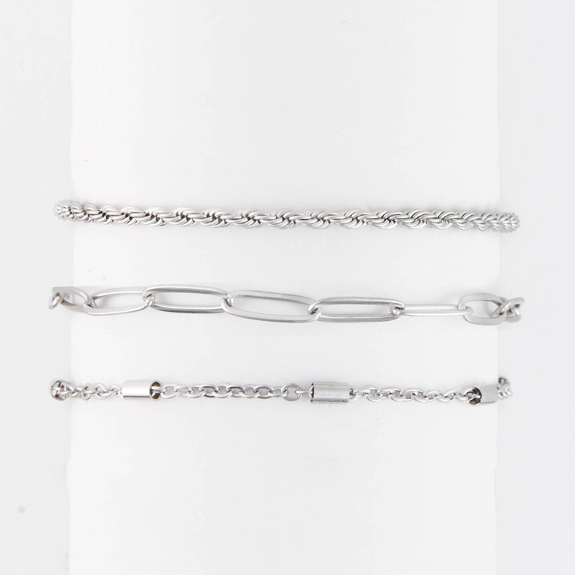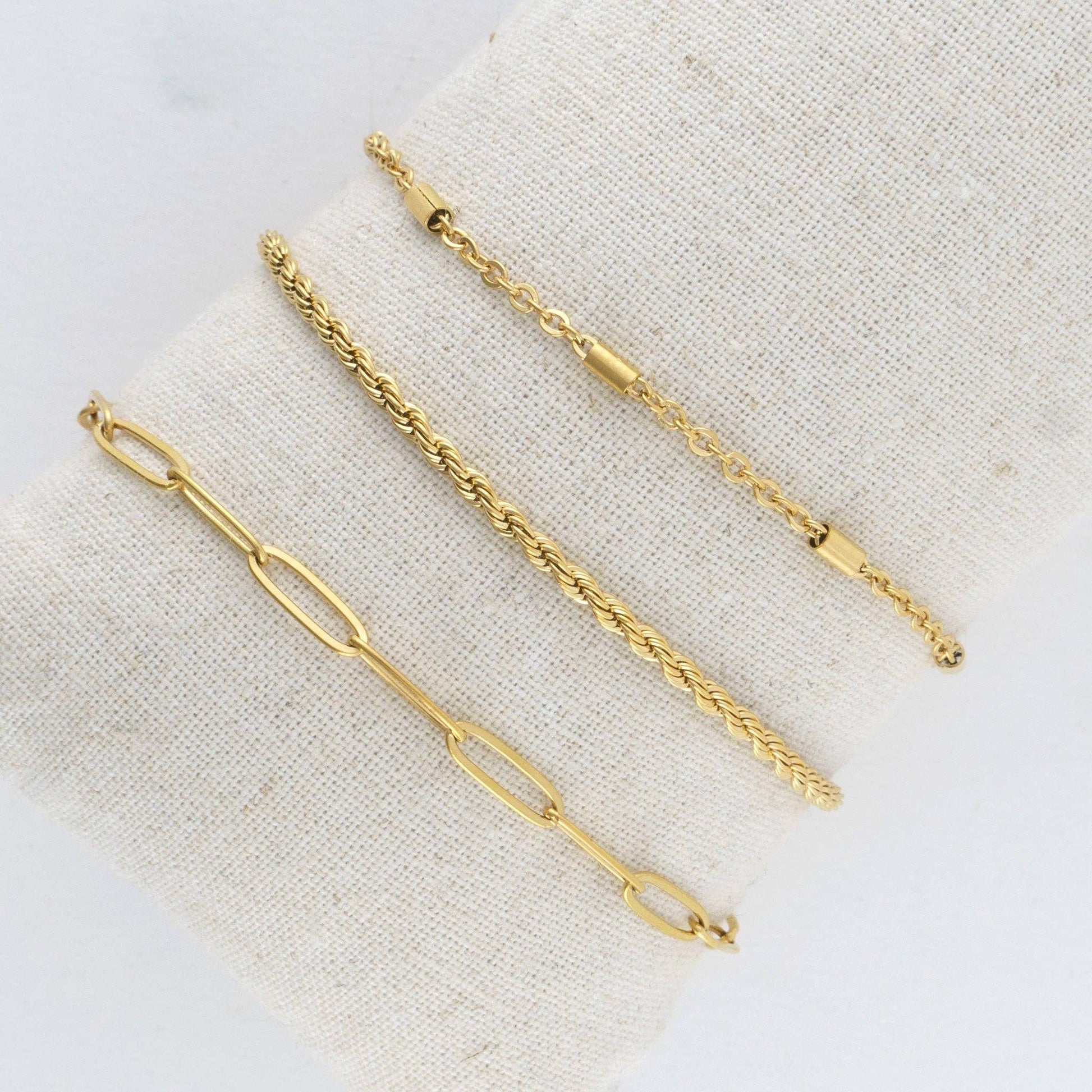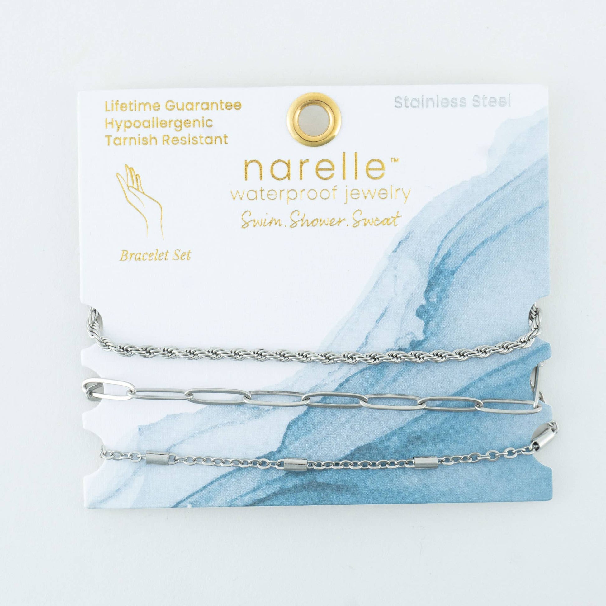 A modern take on classic designs! The Narelle Waterproof Twisted Chain Bracelet Set offers three gold or silver bracelets in trendy Paper Clip, Twist, and Dainty Chain designs. Wear them together as part of a stack, or on their own for a delicate, minimalist look. They styling options are endless! Waterproof, 18K gold or Stainless Steel plated and made with a specialized PVD technique to withstand the rigors of life, from swimming and showering to sweating through your most intense workouts, all without ever losing its shine.
